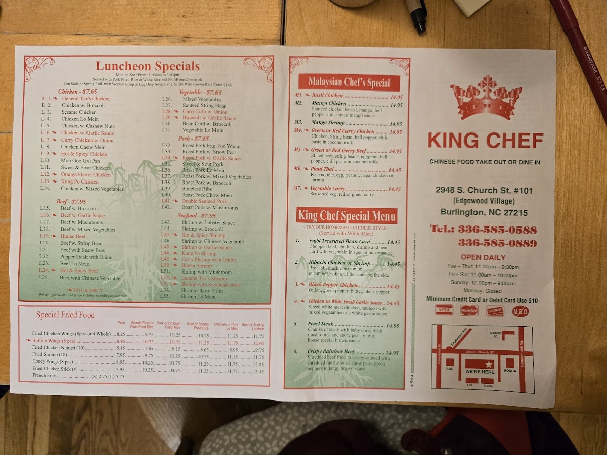 Welcome to King Chef - Burlington, a hidden gem located at 2948 S Church St, Burlington, NC. This charming eatery offers a delightful menu that encompasses classic Chinese flavors with both comfort and authenticity. Starting with appetizers, indulge in crispy Roast Pork Egg Rolls for just $1.25 or the savory Shrimp Egg Rolls at $1.40. For noodle lovers, the Steamed Vegetable Chow Fun and Steamed Chicken Mai Fun both at $6.95 are satisfying choices boasting rich textures and flavors.